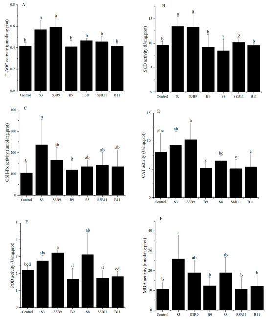 Activities of T-AOC, SOD, GSH-Px, CAT, POD, and MDA content in the hepatopancreas of shrimp for all diet treatments are shown in Figure 1. T-AOC and SOD activities were significantly higher in the S3 and S3B9 groups compared to the other groups (p < 0.05). CAT activity was significantly higher in the S3B9 group compared to the B9, S8B11, and B11 groups (p < 0.05), but not significantly different from the control, S3, and S8 groups (p > 0.05). The GSH-Px activity in shrimp from the S3 group was significantly higher than in the control and B9 groups (p < 0.05), but there was no significant difference with the other groups (p > 0.05). The POD activity in the S3B9 group was significantly higher than in the control, B9, S8B11, and B11 groups (p < 0.05). There was no significant difference in GSH-Px activity among the S3, S3B9, and S8 groups (p > 0.05). The MDA content in shrimp from S3 group was significantly higher than in the control, B9, S8B11, and B11 groups (p < 0.05). The antioxidant capacity in hepatopancreatic tissues of P. monodon was significantly increased in the 3% G. lichenoide group (S3) and the 3% G. lichenoides and 109 CFU/g B. amyloliquefaciens (S3B9).