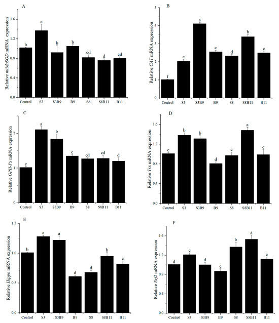 Expression levels of antioxidant genes in the hepatopancreas of shrimp fed different diets for 56 days. (A) mtMnSOD, (B) CAT, (C) GSH-Px, (D) Trx, (E) Hippo, (F) Nrf2. The reference gene is EF-1α. Vertical bars represented the mean ± SD (n = 4) and data indicated with different letters were sig-nificantly different (p < 0.05) among treatments.