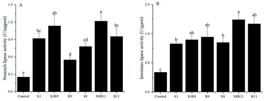Lipase activity in the stomach and intestine of shrimp fed different diets for 56 days. (A) Lipase activity of P. monodon in the stomach. (B) Lipase activity of P. monodon in the intestine. Vertical bars represented the mean ± SD (n = 4) and data indicated with different letters were significantly different (p < 0.05) among treatments.