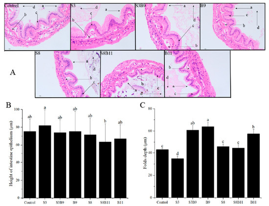 After staining with HE dye, the intestinal tissue of P. monodon showed a higher number of epithelium and neatly arranged brush borders in the experimental group compared to the control group (Figure 4). Vacuoles were almost absent and nuclei in S3 and S8 groups were closely arranged. The height of intestine epithelium in the S3 group was significantly higher than in the S8B11 group (p < 0.05). The folds depth in the S3B9, B9, and B11 groups was also significantly higher than in other groups (p < 0.05). Overall, supplementing the diet with B. amyloliquefaciens (109 CFU/g) improved the intestinal tissue structure of P. monodon.