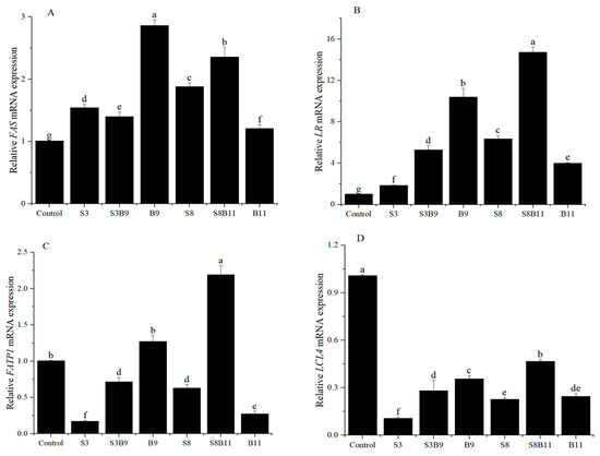 The expression of lipid metabolism genes in the intestine is illustrated in Figure 5. The relative expression levels of fatty acid FAS and LR genes in the shrimp intestine was significantly higher in the groups supplemented with G. lichenoides and B. amyloliquefaciens, either individually or in combination, compared to the control group (p < 0.05). The B9 and S8B11 groups had the highest expression levels of FAS and LR genes. The relative expression levels of intestinal fatty acid transport protein 1 (FATP1) were significantly higher in the B9 and S8B11 groups compared to other groups (p < 0.05), while the expression of FATP1 was lower in the S3, S3B9, S8, and B11 groups compared to the control group (p < 0.05). The expression of long-chain fatty acid-CoA ligase 4 (LCL4) was lower in all experimental groups with G. lichenoides and B. amyloliquefaciens supplementation compared to control (p < 0.05). The results reveal that adding B.amyloliquefaciens (109 CFU/g) and 8% G. lichenoide + B. amyloliquefaciens (1011 CFU/g) had a significant impact on the expression of genes involved in shrimp intestinal lipid metabolism.