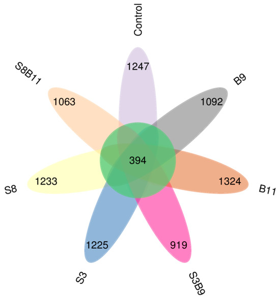 A total of 2,535,118 high-quality sequences were obtained from the intestine microbiota of P. monodon. The sequence length was from 159 to 437 bp. The core OUT (operational taxonomic unit) accounted for 394 (Figure 6). The microbiota coverage of each group was all close to 99%, which suggests that the sequencing depth of this intestinal microbiota analysis was sufficient. Thus, the experimental results were representative. The bacterial richness analysis showed that Chao1 index was increased in the S8, B9 and B11 groups compared with the control group, while there was no significant difference among the groups (p > 0.05) (Table 5).
