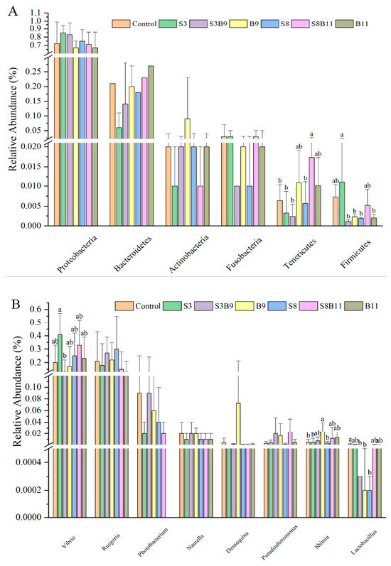 A total of 43 bacterial phyla were identified in the seven groups. Of the dominant phylum, the relative abundances of Tenericutes in the S8B11 groups were increased compared to the control, S3, S3B9, and S8 groups (p < 0.05), yet the relative abundance of Firmicutes in the S3 group was significantly higher than that in the S3B9, B9, S8, and B11 groups (p < 0.05) (Figure 7A). As shown in Figure 7B, at the genus level, the relative abundance of Vibrio in the S3 group were significantly higher than that in the S3B9 (p < 0.05) and had no significant difference with other groups (p > 0.05). Moreover, the relative abundance of Shimia in the B9 group was significantly higher than that of the control, S3, and S8 groups (p < 0.05). However, the relative abundances of Lactobacillus in the S3B9, B9, and S8 groups were significantly lower than that of the control group (p < 0.05).