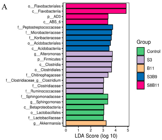 The linear discriminant analysis (LDA) effect size (Lefse) package was used to determine the differential abundances of microbiota taxa among the groups. There are 23 bacteria taxa distinguishing among the experimental groups, except the S8 and B9 groups. The relative abundance of 5, 8, 1, 5, and 4 biomarkers (LDA score > 2.0) was higher in the control, S3, B11, S3B9, and S8B11 groups, respectively. LDA scores of Lefse showed that 8 taxa were increased in the S3 group and there were two groups only enriched at genus level, including Altomonas and Clostridium (Figure 7A). From the results of Lefse cladogram (Figure 8B), 1 phylum, 1 class, 1 order, 4 families, and 2 genera were enriched in the S3, including Firmicutes (from phylum to genus), while 1 phylum, 2 class, and 1 order were enriched in the S8B11 group, including Flavobacteriia (from class to order). At the order level, Acidobacteriales is the possible biomarker for the S3B9 group, while Lactrobacillales was found at the control group. However, no suitable biomarker was found in the S8 and B9 groups.