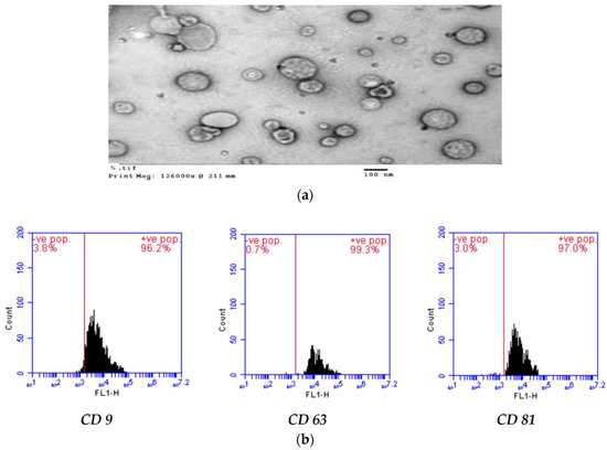 The exosomes derived from mesenchymal stem cell stock (500 μg/mL) were sonicated in phosphate-buffered saline (Pbs, pH 7.4) for 10 min, to ensure their complete solubilization. The Ex morphological identity was confirmed using a transmission electron microscope (TEM, Zeiss, LEO 906E, Jena, Germany). A FACS Caliber flow cytometer (Becton Dickinson, Franklin Lakes, NJ, USA) was applied for the characterization of specific surface markers (CD9, CD63, and CD81) (Sigma Aldrich, USA), by using specific rats’ antibodies purchased from Sigma Aldrish, USA [4,6].