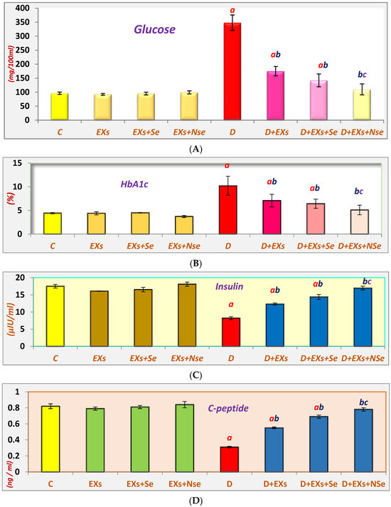 Values expressed as mean ± SEM (n = 8). (A) Serum glucose levels. (B) Serum HbA1c levels. (C) Serum insulin levels. (D) Serum C-peptide levels. Letters a, b, and c indicate significant differences (p ≤ 0.05) compared to control, untreated diabetic, and Ex+Se-treated diabetic groups, respectively.