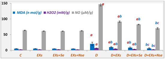 The diabetic rats’ results represented in Figure 4 highlight marked elevations in pancreatic levels of oxidative stress markers (MDA, H2O2, and NO), relative to the control rats. On the other hand, all treated rat groups reflected a significant oxidative marker decrease, with a marked Ex+NSe treatment excellence.