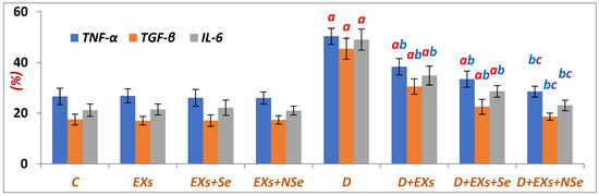 Pancreatic TNF-α, TGF-β, and IL-6 contents. Values expressed as mean ± SEM (n = 8). Letters a, b, and c indicate significant differences (p ≤ 0.05) compared to control, untreated diabetic, and Ex+Se-treated diabetic groups, respectively.
