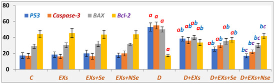 Relative to control, substantial progress in the apoptotic status of diabetic rats’ pancreas was suggested, as seen in Figure 7, by the upregulation of marked apoptotic markers (P53, Bax, and caspase-3%), coupled with the noted anti-apoptotic Bcl-2% diminishing. In contrast, all therapy protocols revealed a tremendous pancreatic anti-apoptotic effect compared to the untreated diabetic rats, with a superior efficacy for the Ex+NSe protocol.