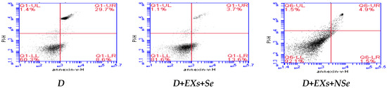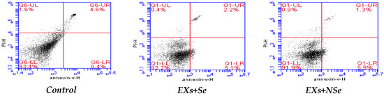 Se or NSe particle incorporation into exosomes was performed using a sonication-aided exosome drug-loading technique according to Haney et al. [23], with modifications. Exosomes were dispersed in 0.1 mg/mL PBS. Either 20 mL of Se solution in DMSO (200 ppm) or 20 mL of NSe in PBS were added to 20 mL of exosome solution forming a Drug-EXs mixture, which was then sonicated using a probe sonicator (750 v, 20% power, 6 cycles by 4 s pulse/2 s pause (total time 24 s), and cooled down for 2 min on ice, before being further sonicated. These steps were repeated 3 times. The drug-loaded exosomes were enclosed in a cellulose dialysis sac (12–14 KDa) for purification. The dialysis bag was sealed properly both from top and bottom and inserted into 7.5 mL of PBS 7.4 at 50 r.p.m. using a shaking incubator at room temperature. After 1 h, the media were collected and replaced with new 7.5 mL of PBS for another 30 min. On the other hand, the same steps were performed to create unloaded exosomes but without adding active ingredients and using PBS only. The obtained sample stocks were divided into insulin syringes (each of 0.5 mL), covered with foil, and stored at −20 °C until use.