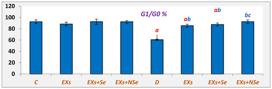 Pancreatic G1/G0%. Values expressed as mean ± SEM (n = 8). Letters a, b, and c indicate significant differences (p ≤ 0.05) compared to control, untreated diabetic, and Ex+Se-treated diabetic groups, respectively.