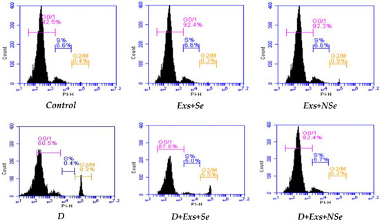 The Figure 10 and Figure 11 data summarize different pancreatic cell cycle phases in different rat groups. Untreated diabetic rats showed a significant downregulation in the G0/G1 cell %, which reflects the pancreatic viable cell %, compared to control rats. On the contrary, relative to untreated diabetic rats, the Ex, Ex+Se, or Ex+NSe injection to diabetic rats exhibited a marked upregulation in the pancreatic viable cell %. However, the Ex+NSe injection recorded a superior enhancement compared to Ex+Se-treated diabetic rats.