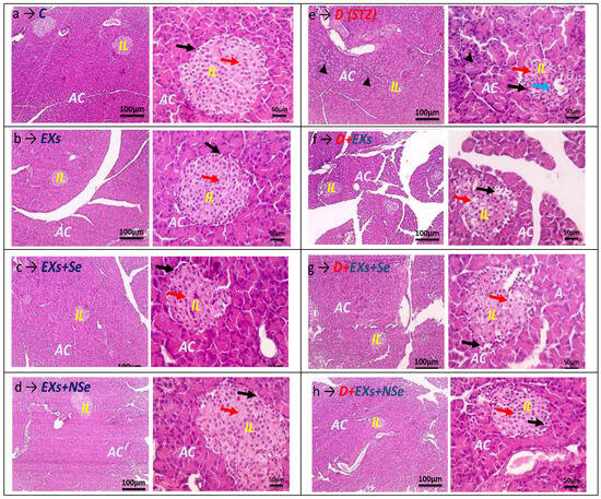 Photomicrograph of HE-stained pancreatic sections in different rat groups. (Low magnification → 100 X: bar 100 and high magnification → 400 X: bar 50). (a–d) Control, Ex, Ex+Se and Ex+NSe normal groups, respectively. These groups showed no histopathological alteration in the normal structure of either the exocrine portion, represented by acinar cells (AC), or the endocrine portion, represented by islands of Langerhans (IL), containing α-cells (black arrows) and β-cells (red arrows). (e) D (STZ-treated) group displayed evident IL degeneration, as seen in the severe hydropic degeneration of most α-cells and β-cells, with few apoptotic β-cells (blue arrow), and pyknotic nuclei of epithelial lining acini (arrowheads). (f–h) Ex-, Ex+Se-, and Exs+NSe-treated diabetic groups, respectively, demonstrated much less hydropic degeneration. However, pancreatic sections from the D+Ex+NSe group exhibited the most markedly improved histological picture of both AC and IL (α and β-cells).