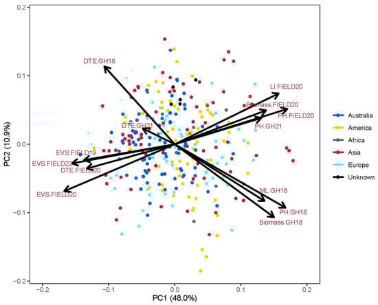Principal component analysis (PCA) was carried out via singular value decomposition on the standardized and centred BLUEs for each environment. A PCA biplot was generated using three packages, tidyverse [36], ggrepel [37] and ggpubr [38], implemented in the R environment (V4.2). The violin plots of different origin groups were generated using ggpubr package. The comparisons among origin groups were carried out using t-test at p < 0.05.