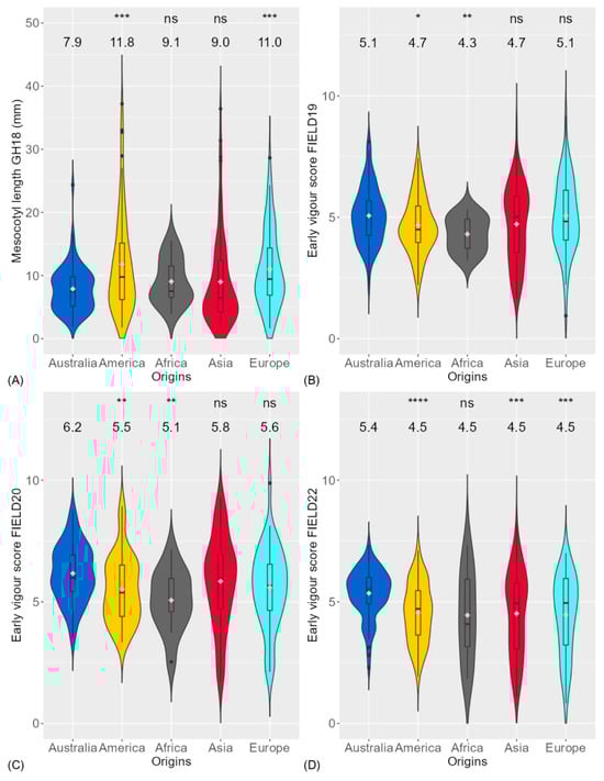 Figure 2. Comparison of genotypic origins for (A) mesocotyl length in glasshouse experiment (GH18) and early vigour score (1 is most vigorous) in field experiment in (B) season 2018–2019 (FIELD19), (C) season 2019–2020 (FIELD20) and (D) season 2021–2022 (FIELD22) between Australia and different origins. Significance levels between Australian genotypes and other origins were displayed on the top of each figure: ns, not significant; *, p < 0.05; **, p < 0.01; ***, p < 0.001; ****, p < 0.0001. The mean of each trait for each origin is displayed below the significance level. The diamonds within each boxplot are the mean of each trait for each region.