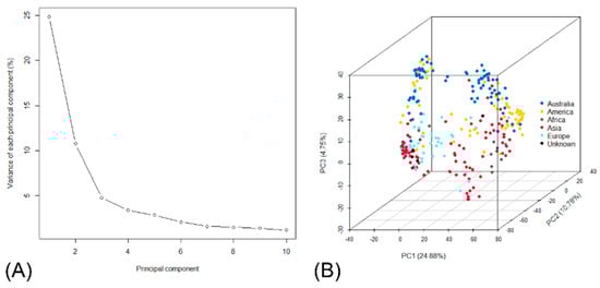 In the PCA of the genotype data, the principal components 1, 2 and 3 accounted for 24.88%, 10.78% and 4.75%, respectively (Figure 4A). The result of PCA with separation based on geographic location is presented in Figure 4B.