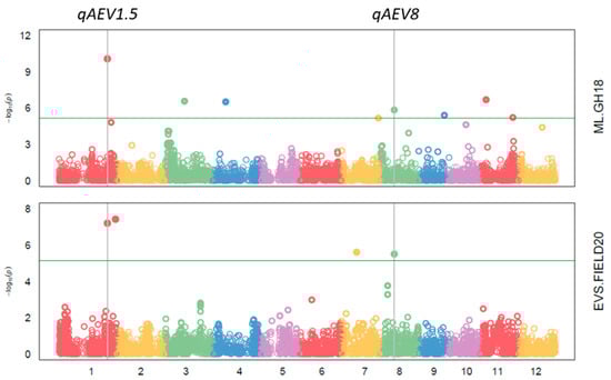 Figure 5. The Manhattan plot of association study of mesocotyl length (ML) in an aerobic glasshouse experiment (GH18) and early vigour score (EVS) in an aerobic field experiment (FIELD20). qAEV1.5 and qAEV8 were two quantitative trait loci (QTL) on chromosome 1 and chromosome 8 for early vigour traits. Green line represents threshold of false discovery rate p < 0.05.