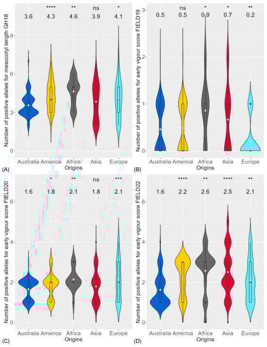 Figure 6. Comparison of genotypic origins for the number of positive alleles associated with (A) mesocotyl length in glasshouse experiment (GH18) and early vigour score in field experiment in (B) season 2018–2019 (FIELD19), (C) season 2019–2020 (FIELD20) and (D) season 2021–2022 (FIELD22) between Australia and different origins. Significance levels between Australian genotypes and other origins were displayed on the top of each figure: ns, not significant; *, p < 0.05; **, p < 0.01; ***, p < 0.001; ****, p < 0.0001. The average number of positive alleles of each origin were displayed below the significance level. The diamonds within each boxplot are the average number of positive alleles of each trait for each region of origin.