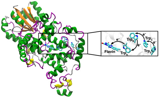 Earlier studies have demonstrated that magnetoreception of migratory birds is blue light dependent [22,23] and the magnetoreception mechanisms are expected to rely on photosensitive molecules. In this regard, the photoreceptor protein cryptochrome 4 (Cry4), which non-covalently binds the chromophore flavin adenine dinucleotide (FAD), was shown to be a suitable candidate for avian magnetoreception found in the double cone cells in the bird’s retina [24,25,26]. Upon blue light excitation, the FAD has been shown to receive an electron from a nearby tryptophan (TrpA), creating the [TrpA·+] RP [24,27]. This fast electron transfer (ET) is followed by a cascade of intra-protein ETs between three further tryptophan residues terminating at a surface tryptophan (TrpD) and resulting in the [TrpD·+] RP (see Figure 1). It is believed that the [TrpD·+] RP is the most stable and has the potential to interact with the geomagnetic field [24,26,28].