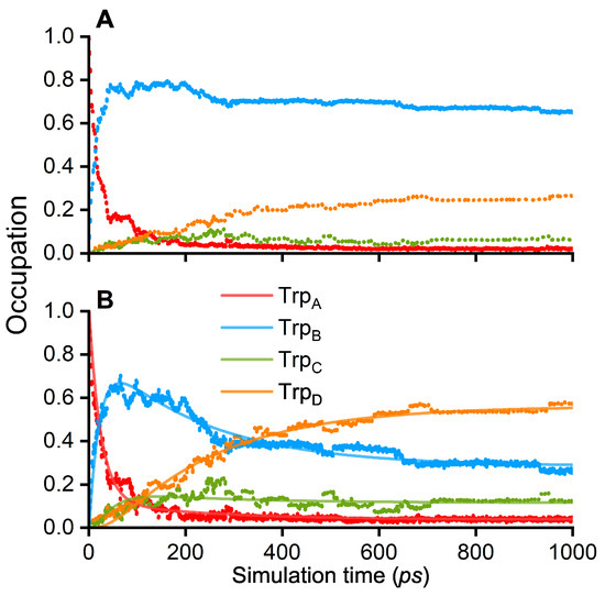 Occupations of the tryptophan sites TrpA, TrpB, TrpC and TrpD with an electron hole plotted over an interval of 1000 ps (points). (A) averaged over 51 QM/MM simulations; (B) averaged over the 23 simulations where an occupation greater than 0.3 was observed at the TrpC or TrpD at some time instance. The solid lines represent numerical fits of the averaged data obtained by the kinetic model in Equations (2)–(5).