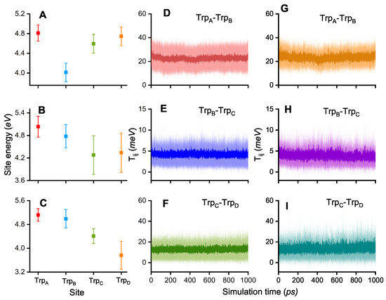 A notable fraction of the QM/MM simulations revealed that the [TrpB·+] RP is very stable when compared to the same QM/MM approach used in earlier ET dynamics in Arabidopsis thaliana Cry1 (AtCry1) [35]. In this regard, the site energies of the Trp residues are important characteristics that influence the ET kinetics. Figure 3A–C illustrates that the site energies of certain Trp sites are the lowest for the simulations that have a high hole occupation at this site; the radical will rather populate a site with the lowest energy as it tends to be in the energetically most favorable state.