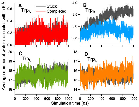 Figure 4 shows that the number of water molecules around the Trp residues do not significantly differ for the stuck and completed cases (see Figure 4A,C,D), except for the case around TrpB for which the number of water molecules is greater with the radical being stuck on TrpB (see Figure 4B). The difference in the number of water molecules around TrpB grows with the simulation time ending with a difference of at least one extra molecule in the case when the electron hole is stuck on TrpB. Although the difference in the number of water molecules is clear, there is significantly less water around TrpB compared to the two near-surface residues TrpC and TrpD. Nevertheless, it is arguable that a high number of water molecules around TrpB stabilizes the RP [TrpB·+] by screening the Coulomb interaction to the other tryptophan sites, which then might even lead to more water molecules around TrpB. This conclusion of a stabilization of the RP state is due to the higher number of water molecules, combined with the result from Lüdemann et al. [35]. This suggests that the solvent is important for ETs and that the completed ETs happen with a certain number of water molecules around the tryptophan sites. A too-high or too-low number of water molecules could, therefore, lead to energetically unfavorable configurations of the protein and ETs become less likely.