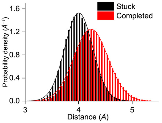 Another characteristic that could affect the ET is the edge-to-edge distance between TrpB and TrpC. One would expect that in the completed simulations the distance between TrpB and TrpC is smaller as the electron could then be transferred more rapidly. Figure 5 shows the calculated distribution of the edge-to-edge distances with a Gaussian fit for the simulations where the electron hole was stuck on TrpB (black) and for the simulations that completed the electron hole transfer along the FAD-Trp chain (red). The results turn out to be the opposite of expectations as the inter-residue distances are slightly greater for the completed ETs; the maxima of the Gaussian fitting curves appear at 4.2 Å for the completed and 4.0 Å for the stuck ETs. The distance is usually a determining factor for ETs the transfer rate constants depend exponentially on the donor acceptor distance in the widely applied Marcus theory [42,46,47,48]. The larger distances in the completed ET cases suggest that the reason for the preferred state in ChCry4 does not exclusively rely on the edge-to-edge distances. Instead, when considering the similarity in the electronic couplings seen in Figure 3D–I and the increased distance for completed ETs, the observed blocking of ET is suggested to be a consequence of increased solvent exposure. Besides that, only 51 simulations were performed due to the utilized resource demanding approach, leaving the possibility for statistical artefacts. The attachment of the electron hole to the TrpB residue along with its unstable behavior at the TrpC residue may both diminish if a greater set of calculations is considered. However, the present investigations only focused on the possibility of an ET, which was clearly demonstrated in Figure 2.