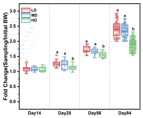 Fold change in body weight based on the initial body weight in different treatment groups after 14, 28, 56, and 84 days. Different stocking density groups with different letters are significantly different according to ANOVA models (p < 0.05).