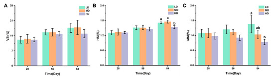 Figure 2A–C shows the effects of different stocking densities on the organ coefficients of trout, including the VSI, HIS, and MSI values. After 28 and 56 days, no significant difference was observed in VSI, his, and MSI. After 84 days, no significant difference was observed in VSI under different stocking densities. The HD group had significantly lower HSI and MSI when compared with the LD group, while a significantly lower HSI was observed under HD when compared with MD.