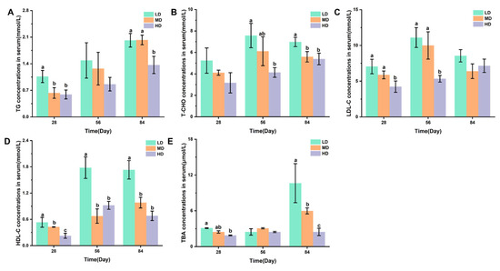 Figure 3A,B shows the changes in TG and T-CHO concentrations in the serum of rainbow trout stocked under different stocking densities. Figure 3C–E shows the changes in the LDL-C, HDL-C, and TBA concentrations in the serum of rainbow trout stocked under different stocking densities. After 28 days, the HD group had significantly lower TG, LDL-C, HDL-C, and TBA contents when compared with the LD group. After 56 days, significantly lower T-CHO, LDL-C, and HDL-C contents were observed under HD when compared with LD. After 84 days, compared with the LD group, the HD group had significantly lower TG, T-CHO, HDL-C, and TBA contents.