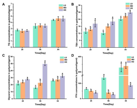 Changes in the gut lipid metabolism of rainbow trout stocked under different stocking densities. (A) TG, triglyceride; (B) TBA, total bile acids; (C) glycerol; (D) FFA, free fatty acids. Values represent the mean ± SD of three replicates (n = 3). Different stocking density groups with different letters are significantly different according to ANOVA models (p < 0.05).