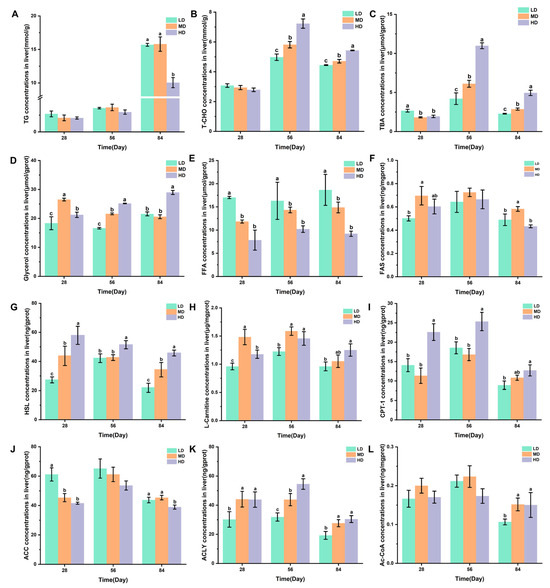 Changes in the liver lipid metabolism of rainbow trout stocked under different stocking densities. (A) TG, triglyceride; (B) T-CHO, total cholesterol; (C) TBA, total bile acids; (D) glycerol; (E) FFA, free fatty acids; (F) FAS, fatty acid synthase; (G) HSL, hormone-sensitive lipase; (H) L-carnitine; (I) CPT-1, carnitine palmitoyltransferase I; (J) ACC, acetyl-CoA carboxylase; (K) ACLY, ATP citrate lyase; (L) Ac-CoA, acetyl coenzyme A. Values represent the mean ± SD of three replicates (n = 3). Different stocking density groups with different letters are significantly different according to ANOVA models (p < 0.05).