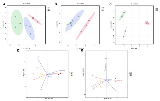 The multivariate analysis of the biochemical lipid indicators of rainbow trout is shown in Figure 6. As can be seen from Figure 6A–C, three groups of samples can be clearly distinguished in the PCA plots. In the PCA results of three organs, the first axis captured 70.1%, 75.2%, and 73% of the total variability, while the second axis captured only 21.5%, 20.7%, and 13.2%. Meanwhile, the LD group always had the lowest coordinates on the first axis, while the HD group always had the highest coordinates.
