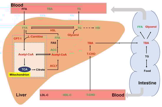 Integrative map of changes in the lipid metabolism of rainbow trout. Different colors represent significant upregulation or downregulation under HD when compared with LD. Red: upregulation; green: downregulation. TG, triglycerides; T-CHO, total cholesterol; TBA, total bile acids; glycerol; FFA, free fatty acids; FAS, fatty acid synthase; HSL, hormone-sensitive lipase; CPT-1, carnitine palmitoyltransferase I; ACC, acetyl-CoA carboxylase; ACLY, ATP citrate lyase; Ac-CoA, acetyl coenzyme A; LDL-C, low-density lipoprotein cholesterol; HDL-C, high-density lipoprotein cholesterol.