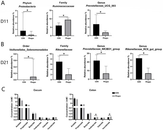 As shown in Figure 4B, at day 11 and day 21, Bacteroidota and Firmicutes remained the dominant phyla in both groups, followed by Actinobacteriota. The top three families were Prevotellaceae, Oscillospiraceae, and Ruminococcaceae. On the 11th day, at the phylum level (Figure 5A), the relative abundance of Proteobacteria in the phages group was significantly lower than in the control group (p < 0.05). At the family (top 20) and genus (top 30) levels, the relative abundance of Ruminococcaceae increased significantly, and Prevotellaceae_UCG_003 decreased significantly in the phages group (p < 0.05). On the 21st day (Figure 5B), at the order level, the relative abundance of Veillonellales_Selenomonadales in the phages group saw a significant increase (p < 0.05). At the family level (top 20), the relative abundance of Rikenellaceae was significantly reduced in the phages group (p < 0.05), with this difference extending to the significant decrease in Rikenellaceae_RC9_gut_group at the genus level (p < 0.05). Additionally, at the genus level, the relative abundance of the Prevotellaceae _NK3B31_group in the phages group also saw a significant decrease (p < 0.05).