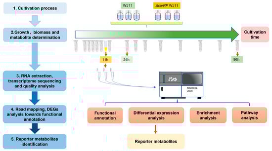 3.2. Transcriptome Data and DEGs across Pairwise Comparisons of WJ11 and ΔcarRP WJ11 Cultures