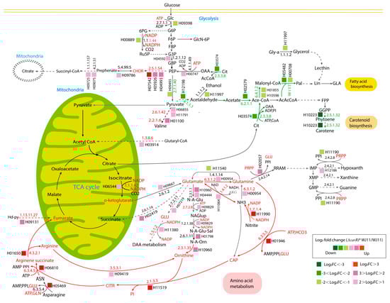 | Gene Name | Functions (EC Number) | Metabolic Pathway | Log2FC |