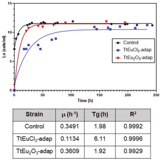 Growth curves were obtained for the three strains (control, TtEuCl3-adap and TtEu2O3-adap) by counting cells in a Neubauer chamber from aliquots of the different cultures at different times. Subsequently, using the informatics application DMFit (http://browser.combase.cc/DMFit.aspx, accessed on 21 September 2023), growth curves were constructed according to the model proposed by [41]. The two parameters obtained from the growth curves were the specific growth rate (or speed) μ (h−1) and the generation time Tg (h).