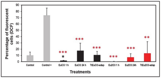 Peroxide generation detected by DCF fluorescence. Gray bars: control (untreated) and positive control (+). Black bars: EuCl3-treated cultures (1 or 24 h) and TtEuCl3-adapted strain. Red bars: Eu2O3-treated cultures (1 or 24 h) and TtEu2O3-adapted strain. Red stars represent significant differences with respect to the positive control and the black star represents significant differences with respect to the untreated control. Stars denote significant differences [p ≤ 0.05 (*), p ≤ 0.01 (**), p ≤ 0.001 (***)].