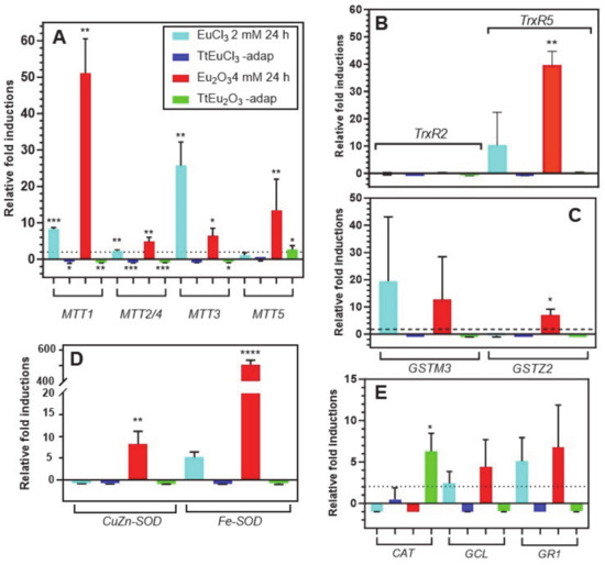 Both europium compounds induce the expression of all T. thermophila MT genes, at different levels, except MTT5, which is only significantly induced (p ≤ 0.01) under europium oxide stress. In addition, the TtEu2O3-adap strain shows a significant (p ≤ 0.05) overexpression (2.6-fold) of the MTT5 gene bordering the threshold of the minimum fold-change value (2-fold, dashed line in Figure 3A), which is considered by consensus as a significant relative quantification of the gene expression induction. Under EuCl3 stress (24 h), the ranking of MTT gene expression induction values is MTT3 > MTT1 > MTT2/4. However, under Eu2O3 stress (24 h), the ranking is MTT1 >> MTT5 > MTT3 > MTT2/4. As found in previous work [62,63], the ranking of these MT genes varies depending on the metal and treatment conditions. In this case, it is the same metal (Eu), although forming part of a different compound.