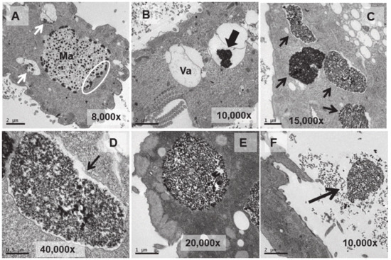 TEM images of cells treated with EuCl3 (2 mM, 1 h treatment). (A): Macronucleus (Ma) with a large number of nucleolar bodies (region within the ellipse). Vacuoles with an electrodense content (arrows). (B): Vacuole (Va). Black arrow indicates electrodense content. (C): Numerous vacuoles (arrows) containing an electrodense granular material (bioaccumulation). (D,E): Magnified images of vacuoles containing electrodense material. In (D) the vacuolar membrane is observed (arrow). (F): Ejection of the electrodense granular content (arrow) outside the cell.