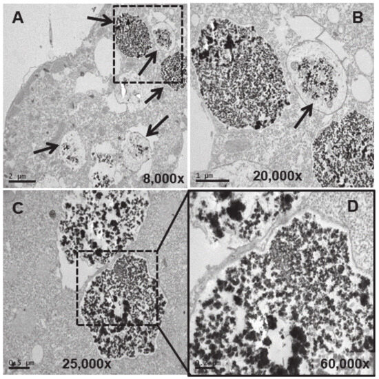 A larger number of vacuoles with an electrodense granular content are visible (arrows in Figure 5A,B). These vacuoles (~2–3 μm in length) bioaccumulate an electrodense granular material, presumably europium (Figure 5C–E). The vacuolar membrane enclosing this electrodense granular material is clearly visible in Figure 5D (arrow). Finally, this granular content is expelled from the cell by fusion of the vacuolar membrane with the ciliate envelope (Figure 5F). In the culture treated for 24 h with EuCl3, a higher number of vacuoles is observed at different bioaccumulation stages of the electrodense granular material (Figure 6A,B). The electrodense granules (~0.1 μm in diameter) condense into larger granules or clusters within the vacuole (Figure 6C,D).