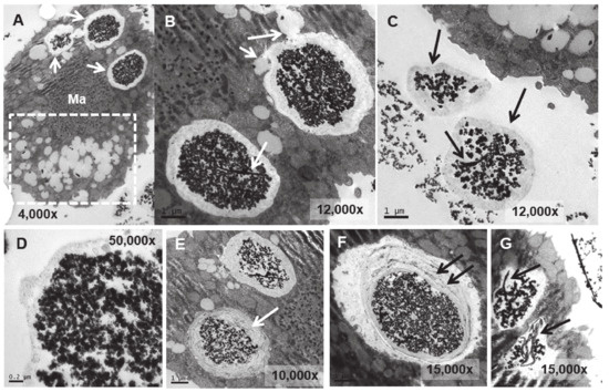 In the TtEuCl3-adap strain, the electrodense granular content is more condensed within the vacuole and surrounded by a broad electrolucent region (Figure 7A,B,D). Membrane structures sometimes appear in this region surrounding the electrodense granular material (arrows in Figure 7E,F). In Figure 7A (dashed line box), a large number of lipid droplets are seen fusing with each other and with the vacuoles containing the electrodense granular material (arrows in Figure 7A,B). As the lipid droplet membrane fuses with that of the vacuole, it deposits its contents inside the vacuole, surrounding the granular material. When the granular contents of these vacuoles are excreted, they are also accompanied by the electrolucent envelope region (arrows in Figure 7C). The contents of some vacuoles also present electrodense fibrillar structures, in addition to the granular material, which are also expelled outside the cell (arrows in Figure 7C,G).