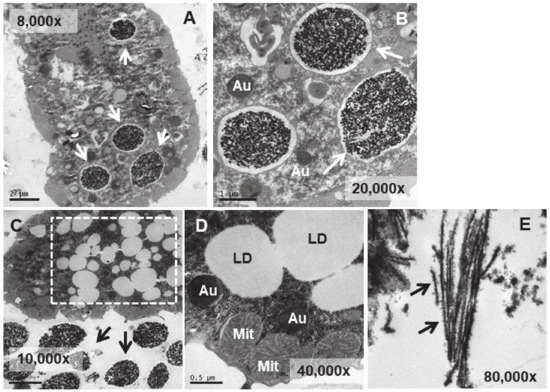 TEM images of TtEu2O3-adap cells. (A): Vacuoles with electrodense granular contents and a thin electrolucid envelope (arrows). (B): Magnified region from panel (A). Au (autophagosomes). (C): Region with numerous lipid droplets (dashed line box). Electrodense granular material ejected out of the cell (arrows). (D): Cytoplasmic region with mitochondria (Mit), autophagosomes (Au) and lipid droplets (LD). (E): Bundles of fibers with adhered electrodense material ejected out of the cell (arrows).