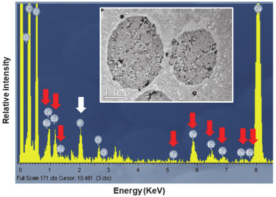 Spectra obtained by TEM-XEDS analysis. Internal TEM micrograph shows vacuoles on which elemental microanalysis was performed. Red arrows indicate the presence of europium, and the white arrow shows the presence of phosphorus.