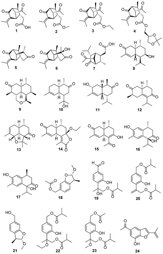 E. adenophorum Spreng. (E. adenophorum) is synonymous with Ageratina adenophora (Spreng.) R. M. King & H. Rob., a perennial and herbaceous invasive plant that is ubiquitous worldwide [23]. Although it is invasive, it has been traditionally used as a medicine for treating wounds, inflammation, fever, diabetes, dysentery, and other ailments. Phytochemical investigations have revealed that this is a sesquiterpenoid-rich plant (Figure 2). In total, 30 new compounds were reported (Table 1), namely 17 sesquiterpenoids, 6 thymol derivatives, 3 benzofuran derivatives, 2 flavonoid glycosides, 1 monoterpenoid glucoside, and 1 chromene derivative [23,24,25,26,27,28,29,30,31,32,33,34,35].