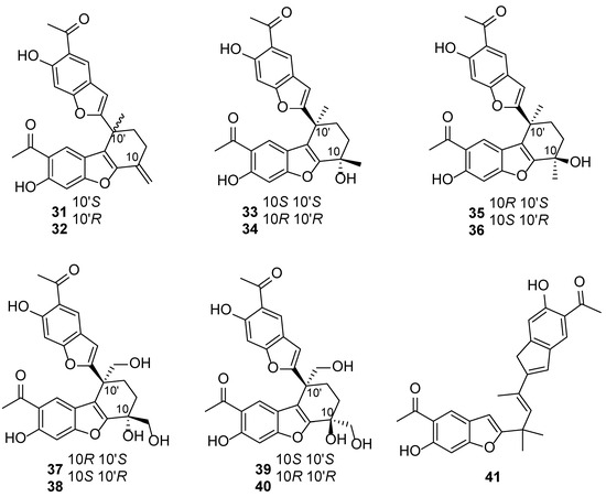 Compounds 1–7 represent two classes of sesquiterpenoids with a novel carbon skeleton. Eupatorid A (1) and its esterified derivatives, eupatoresters A–C (2–4) [23] and dihyroeupatorid A (7) [26], have a 5/5 bicyclic carbon skeleton. Adenophorone (5) [28] and eupatorione A (6) [25] possess a 5/5/6 tricyclic carbon skeleton. Conspicuously, NPRs had continuously selected compounds 1 and 6 as hot molecules [21,22], because their structures were novel. Unfortunately, the aforementioned seven compounds exhibited no significant activities in the anti-inflammatory, in vitro tumor growth inhibitory, and antibacterial assays, except 5, which displayed potent neuroprotective activity in H2O2-treated human neuroblastoma cells (SH-SY5Y) and pheochromocytoma cells (PC12) [24]. Compounds 8–17 are typical cadinene-type sesquiterpenoids. However, none of them exhibited significant activities in bacteriostatic, α-glycosidase, and acetylcholine esterase (AChE) inhibitory tests [26,27,28,29,30,31]. Compounds 18–23 are thymol derivatives. Compound 18 displayed in vitro bacteriostatic activity against Gram-positive bacteria such as Staphylococcus aureus, Bacillus cereus, and B. subtilis, with minimum inhibitory concentrations ranging from 25 to 50 μg/mL [31,32,33]. Compound 19 exhibited a strong activity against five microorganisms, S. aureus, B. cereus, B. thuringiensis, Escherichia coli, and Salmonella enterica, with MIC values ranging from 3.9 to 15.6 μg/mL. Additionally, compound 19 showed strong cytotoxicity against human breast cancer cells (MCF-7), human cervical carcinoma cells (HeLa), and human large-cell lung cancer cells (NCI-H460) and its half-maximal inhibitory concentration (IC50) values were 7.45, 9.45, and 8.32 μM, respectively [32]. Compounds 24–26 are benzofuran derivatives. Among them, compound 24 at 50 μg/disk exhibited broad-spectrum antifungal activity against the growth of Colletotrichum gloeosporioides, C. musae, Rhizoctonia solani, and Fusarium oxysporum f. sp. Niveum, with inhibitory zones having diameters ranging from 13.90 to 17.28 mm [34]. Compounds 27 and 28 are a chromene derivative and a monoterpenoid glucoside, respectively [34]. Compounds 29 and 30 are two highly oxygenated flavonoid glycosides exhibiting potent 2,2-diphenyl-1-picrylhydrazyl radical scavenging activity, with IC50 values of 12.0 and 22.9 μM, respectively [35].