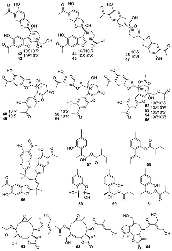 E. chinense is used as Chinese medicine in the Tujia and Miao minorities of China. The leaves of this plant are also termed “Liu-Yue-Xue” and are used as a folk medicine for cold prevention and treatment. Its roots are widely used as a traditional Chinese medicinal material “Tu-Niu-Xi” and it has a long history of medicinal applications, because of its various pharmacological activities, such as heat-clearing, anticancer, anti-inflammatory, and antiviral activities. It is especially used as a well-known drug for the treatment of diphtheria in Guangdong Province, China [36,37]. Consequently, chemical investigations on E. chinense have predominantly focused on its roots to discover active components. In summary, 57 chemical constituents (31–87) were found in different parts of E. chinense (Table 2), namely 26 benzofuran oligomers, 25 sesquiterpenoids, 5 thymol derivatives, and 1 diterpenoid [36,37,38,39,40,41,42,43]. Of note, its roots are chiefly composed of benzofuran oligomers and thymol derivatives, whereas sesquiterpenoids are dominant in the aboveground parts (Figure 3). Compounds 31–56 are benzofuran dimers and trimers and are isolated from the roots. Of them, compounds 31–45, 50 and 51, as well as 54–56 displayed inconspicuous activities in in vitro antiviral, anti-inflammatory, and cytotoxic assays [40,41,42]. Compounds 46–49, 52, and 53 exhibited promising inhibitory effects on NO production, with IC50 values of 6.42, 6.29, and 16.03 μM, respectively [38]. Compounds 57–61 are thymol derivatives and are isolated from the roots [39,40]. Compound 59 exhibited moderate inhibitory effects on NO production, with the inhibition rate reaching 23.08% at 50 μM [39]. Compound 60 displayed marked cytotoxic activities against human nasopharyngeal carcinoma cells (CNE 2), human cervical cancer cells (Caski), and human gastric cancer cells (HGC-27), with IC50 values of 4.2, 11.9, and 7.3 μM, respectively [40]. Compounds 62–86 are sesquiterpenoids, namely 10 germacrane-type and 2 guaiane-type, and are isolated from the aerial parts of the plant [37,41,42,43]. Compounds 62 and 63 exhibited moderate cytotoxic activities against human breast cancer cells (MDA-MB-231) and human hepatocellular carcinoma cells (HepG2), with IC50 values ranging from 3.1 to 9.3 μM [37]. Compounds 79–81 exhibited cytotoxicity against MDA-MB-231 and HepG2, with IC50 values of 0.8–7.6 μM [43]. Compound 87 is an acyclic diterpenoid. Usually, a diterpenoid is rarely found in the genus Eupatorium [42].