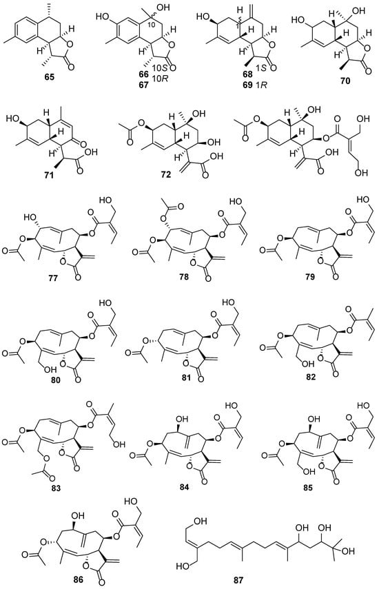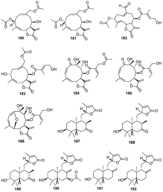 E. lindleyanum, referred to as “Ye-Ma-Zhui” by the local Chinese population, is used for tracheitis and cough treatment and has a bitter, acerbic taste. Compounds 180–183 are sesquiterpenoids isolated from E. lindleyanum (Table 5 and Figure 6) [57,58,59]. Compounds 180 and 181 displayed excellent anti-inflammatory activities by lowering tumor necrosis factor-α and interleukin 6 levels in lipopolysaccharide-stimulated murine macrophage RAW 264.7 cells (p < 0.001) [57]. Compound 182 can dramatically attenuate NO secretion at 7.5 μM [58].