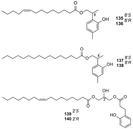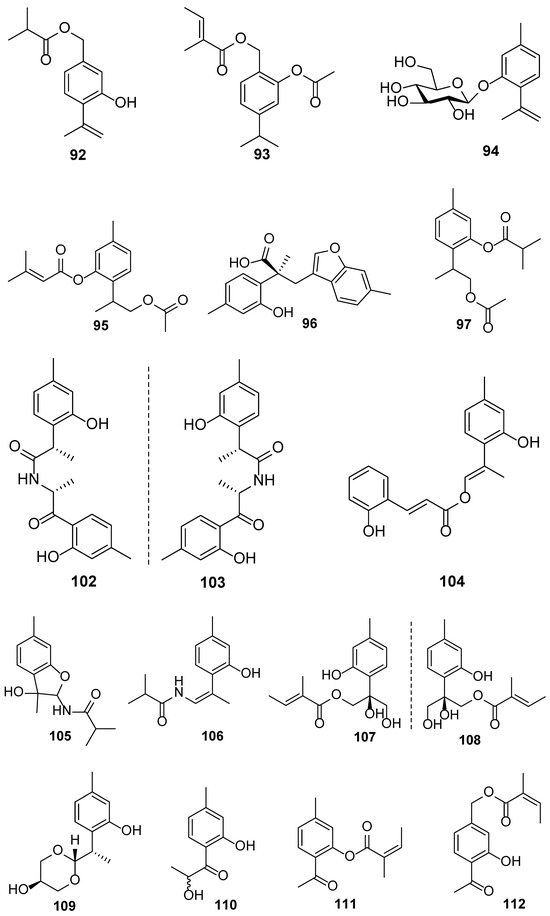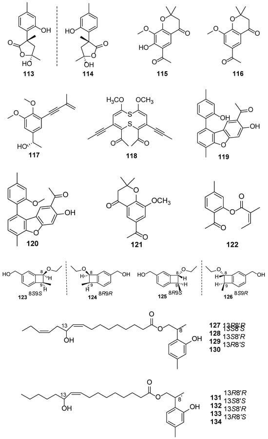 E. fortunei Turcz. is a perennial herb that primarily grows in the subtropical and warm temperate regions of China. Being a common aromatic and medicinal species with over 2000 years of utilization, it is widely cultivated in most eastern provinces of China. This herb has the function of removing dampness and summer heat from the body. From a modern scientific perspective, some medical symptoms relieved using this herb are partially related to inflammation. The National Health Commission of China has also incorporated this plant into the list of herbal species that can be used as additives to functional foods [44,45,46,47,48,49]. In total, 53 compounds (88–140) are isolated from the aerial parts of E. fortunei (Table 3), namely 27 thymol derivatives (88–114), 4 acetophenones (115–118), 2 benzofuran derivatives (119–120), 1 chromanone (121), 1 dithiecine (122), 4 monoterpenoids (123–126), and 14 fatty acid derivatives (127–140) (Figure 4) [44,45,46,47,48,49,50,51,52]. Compounds 89 and 90 exhibited cytotoxicity against MCF-7, HeLa, human lung cancer cells (A549), and HepG-2, with IC50 values of 6.24–11.96 μM [45]. Compound 105 displayed moderate activity, with an IC50 value of 24.27 μM [49]. Compound 119 showed potent cytotoxicity against A549 and MCF-7, with IC50 values of 5.95 and 5.32 µM, respectively [50]. Compounds 123–126 showed promising inhibitory effects on NO production, with the inhibition rate reaching 68.9%, 67.4%, 62.6%, and 65.1%, respectively, at 10 µM [51].